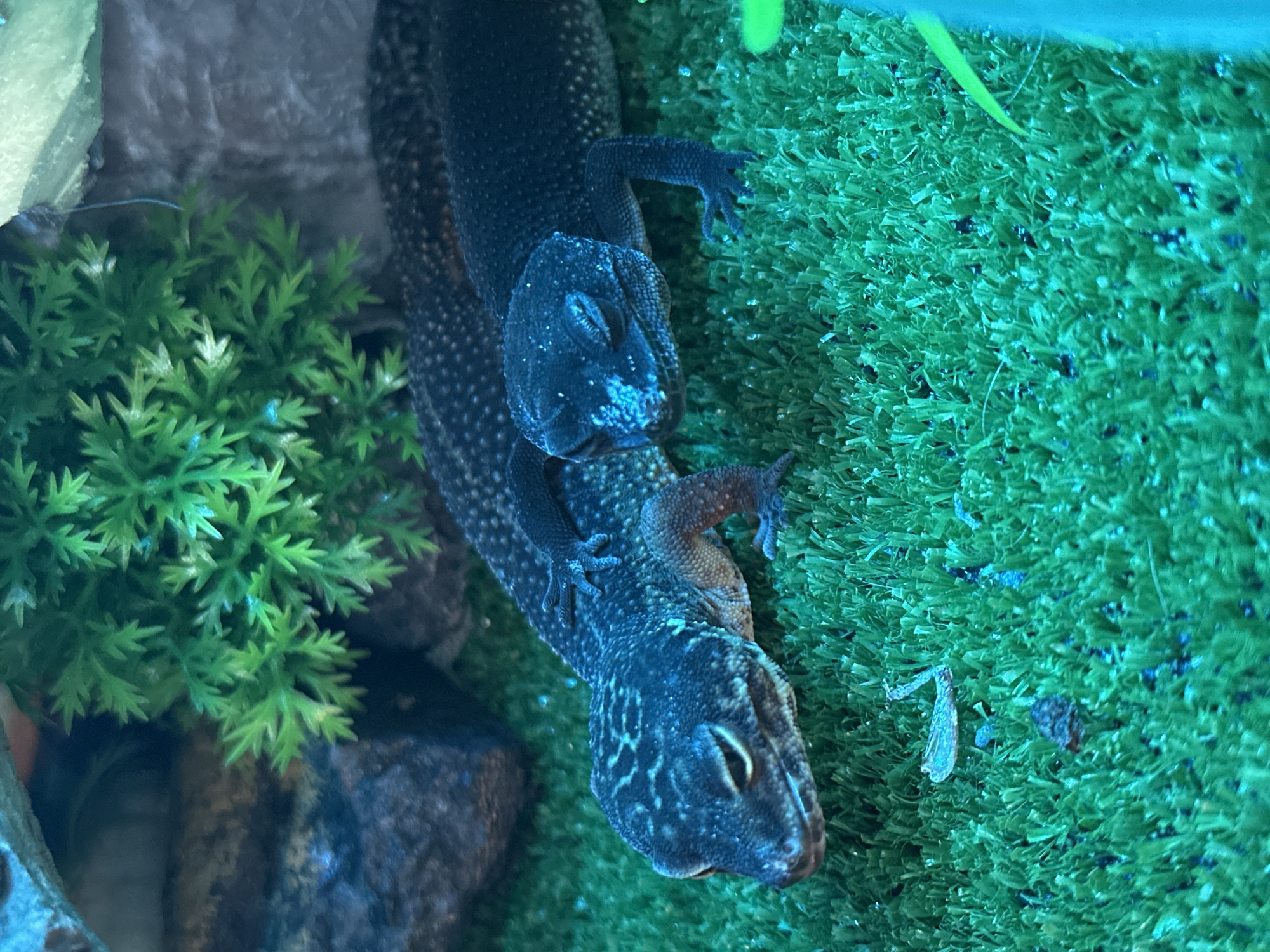 Within an enclosed environment in the city of Khimki, Russia, two dark-bodied geckos are positioned on artificial green turf. The larger gecko rests horizontally in the foreground, displaying numerous small, light-colored spots across its dark skin and a lighter-colored ventral area near its legs. Its head is oriented to the left, with eyes appearing closed. A second, smaller gecko is positioned on the back of the first, also with its head to the left and eyes closed. This smaller gecko exhibits similar spotting and has visible white particulate matter on its head and snout. Its left foreleg rests on the back of the larger gecko. In the background, dark rock-like structures and a cluster of artificial green foliage are present. The artificial turf beneath the geckos contains scattered small dark debris and a piece of light-colored, possibly organic, detritus. The scene is illuminated with a cool light, imparting a bluish cast to the geckos and highlighting the vibrant green of the turf and artificial plants.