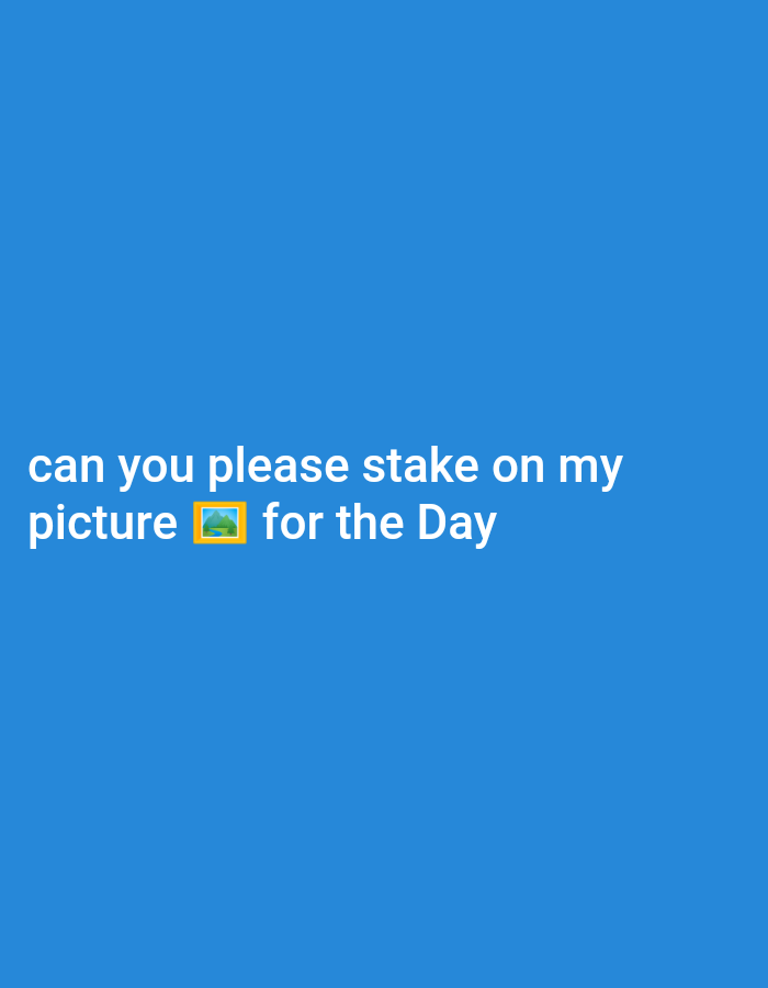A request is presented against a solid blue background. The text reads, "can you please stake on my picture 🖼️ for the Day." A landscape picture emoji is incorporated within the sentence, presumably referencing the picture in question. The phrase "stake on my picture" suggests an interest in garnering support or attention for the image.