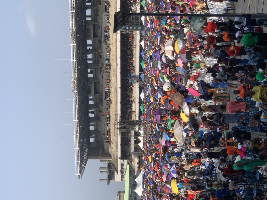This image captures a vast outdoor gathering at Tafawa Balewa Square, Lagos Island, Lagos, Nigeria, under a clear, bright daytime sky