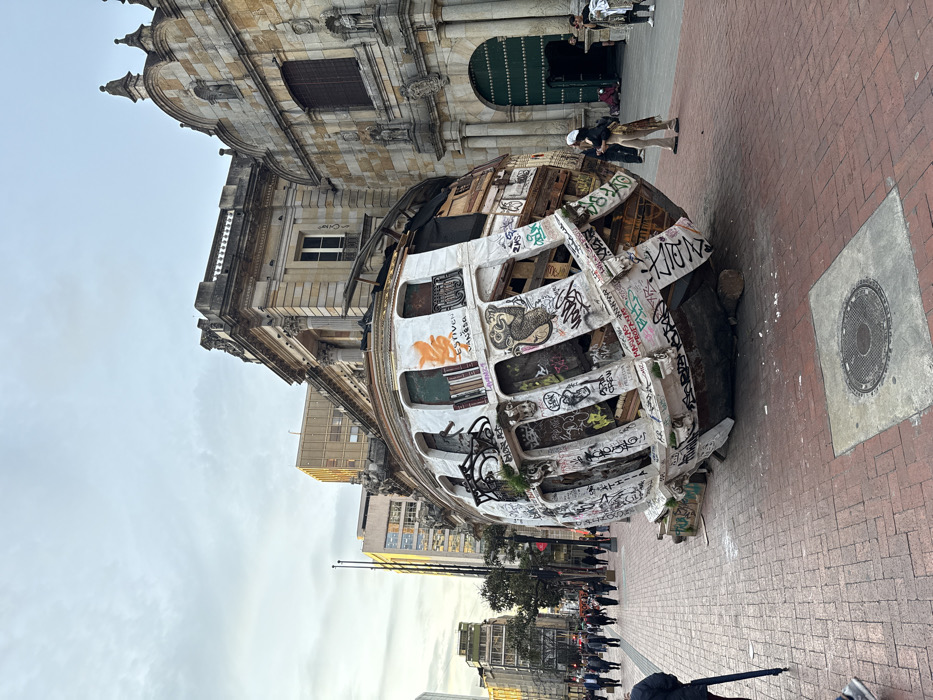 This image captures an outdoor urban scene in the historic center of Bogotá, Colombia, specifically on Carrera 7 near the Cathedral Primada de Bogotá. The central subject is a large, irregularly shaped art installation resembling the inverted, deconstructed hull of a wooden boat. This structure is approximately ovoid, composed of white-painted sections and exposed raw wooden planks, and is heavily covered in multicolored graffiti tags, text, and illustrations, including an owl and a monkey. It rests directly on a base of irregular blocks on the brick pavement. The ground is paved with reddish-brown interlocking bricks, interrupted by a few square grey concrete slabs containing circular metal manhole covers. Minor debris is visible around the base of the art piece. In the background, to the right of the installation, stands the stone facade of the Cathedral Primada de Bogotá, characterized by classical architectural elements, columns, arched niches with statues, and a prominent dark green double-door entrance that is partially ajar. Several individuals are discernible near the cathedral entrance; one person in light-colored trousers, a dark top, and a white hat stands facing the art installation. Other figures are seated or standing near the steps. To the left of the cathedral, another ornate classical building with light-colored stone or stucco, featuring columns, balconies, and multiple windows, forms a continuous backdrop. Further to the left, a wide pedestrian street extends into the distance, lined with modern multi-story buildings and populated by numerous pedestrians, predominantly adults in business casual attire, walking away from the camera. The sky is overcast and pale blue-grey, indicating soft, diffused lighting, consistent with either early morning or late afternoon. A partially visible person with a blue umbrella handle is present in the extreme foreground on the left.