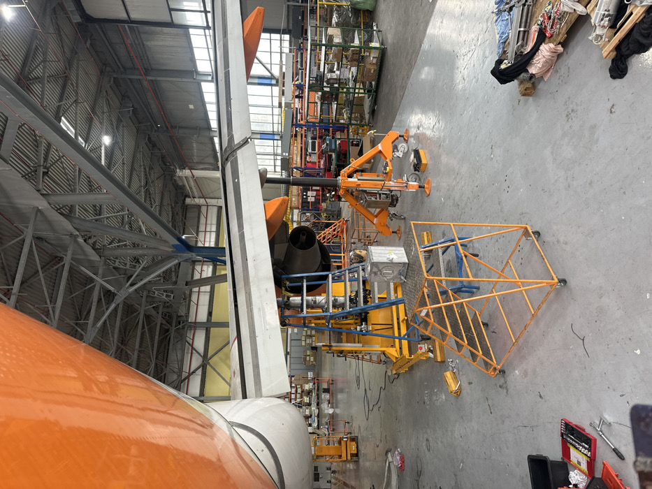 The image depicts the interior of an aircraft maintenance hangar located in Aksakovo, Bulgaria. A large commercial aircraft, characterized by its orange fuselage and white wing with orange wingtips, is the central subject, undergoing maintenance. Its right wing is prominently featured, with an engine visible beneath it. The wing's flaps appear to be extended or in a maintenance position. No individuals are present. The concrete floor is grey and generally clean, with some scattered debris and tools. In the immediate foreground, a black toolbox with various metal tools, including wrenches and sockets, is open on the left. To the right of the toolbox, an orange, wheeled metal work platform with four steps is positioned near the aircraft. Behind it, a blue metal platform is partially visible. Underneath the aircraft's wing, a large yellow hydraulic lift assembly supports the wing and engine area. A blue metal ladder or scaffolding structure is integrated with this lift. A rectangular silver container rests on a platform attached to the yellow lift, adjacent to the engine. Further to the right, an orange mobile lifting device with three splayed legs is positioned on the floor, supporting a component, possibly part of the aircraft or engine. A yellow battery pack and associated cables are on the floor nearby. In the mid-ground and background, other yellow mobile platforms or lifts are visible. To the right, multiple metal shelving units are stocked with various items, including boxes, components, and tools. Wooden pallets laden with miscellaneous items, such as fabric and metal parts, are stacked on the right side of the floor. The hangar features a high, industrial ceiling with exposed metal trusses, beams, and overhead lighting fixtures. Windows line the upper section of the far wall, providing natural light, supplemented by artificial illumination. Red piping is visible running along the upper sections of the walls.