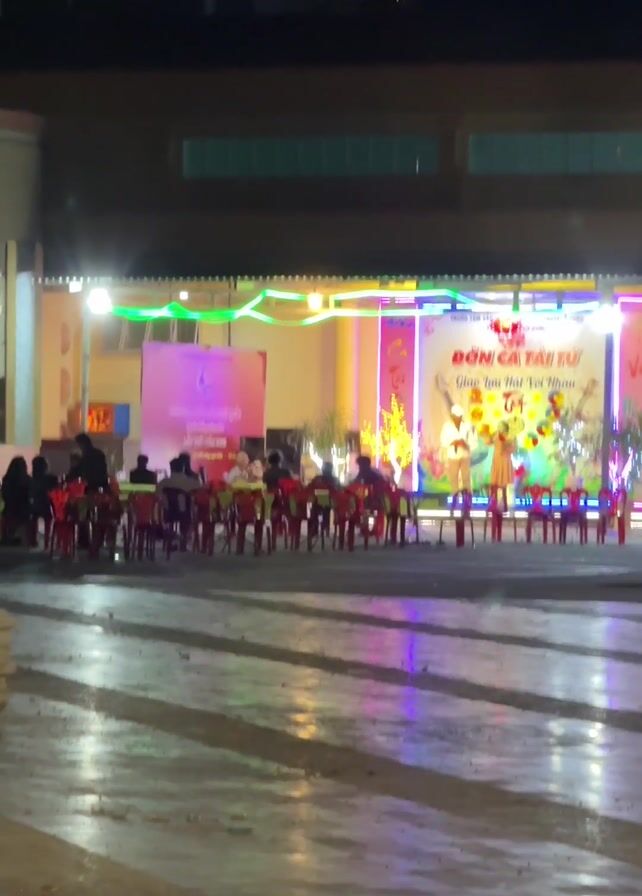 A long shot depicts an outdoor stage during a nighttime event in Vietnam. On the stage, a banner reads "ĐỜN CA TÀI TỬ" with additional Vietnamese text, indicating a musical performance. Colorful decorations and balloons frame the stage. A woman in a light-colored dress is standing in front of the microphone, possibly performing or about to perform. Several rows of red plastic chairs and tables are arranged in front of the stage, where a group of people are seated, appearing to be an audience. They are mainly silhouettes due to the backlighting from the stage. A security guard can be seen standing near the stage. The ground is paved with large, rectangular stones, and there is some reflective moisture on the surface, likely from a recent rain. The light from the stage and surrounding area is reflecting off the wet pavement, creating a shimmering effect. The background features a low building with windows, some of which are lit. Some branches of trees are visible at the top of the frame on either side. A person in a hardhat and a light-colored uniform rides a scooter in front of the camera and past the stage, blurring the camera's point of view briefly.