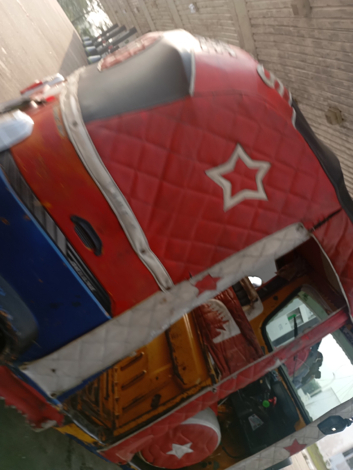 A rotated close-up shot features a vibrant auto rickshaw, predominantly red, blue, and yellow. Quilted red fabric with a white star accentuates the vehicle's roof. The body is a mix of blue and yellow, adorned with white trim speckled with red stars. Reflections in the window reveal a partial interior view. The shot is taken outdoors, blurring the background.