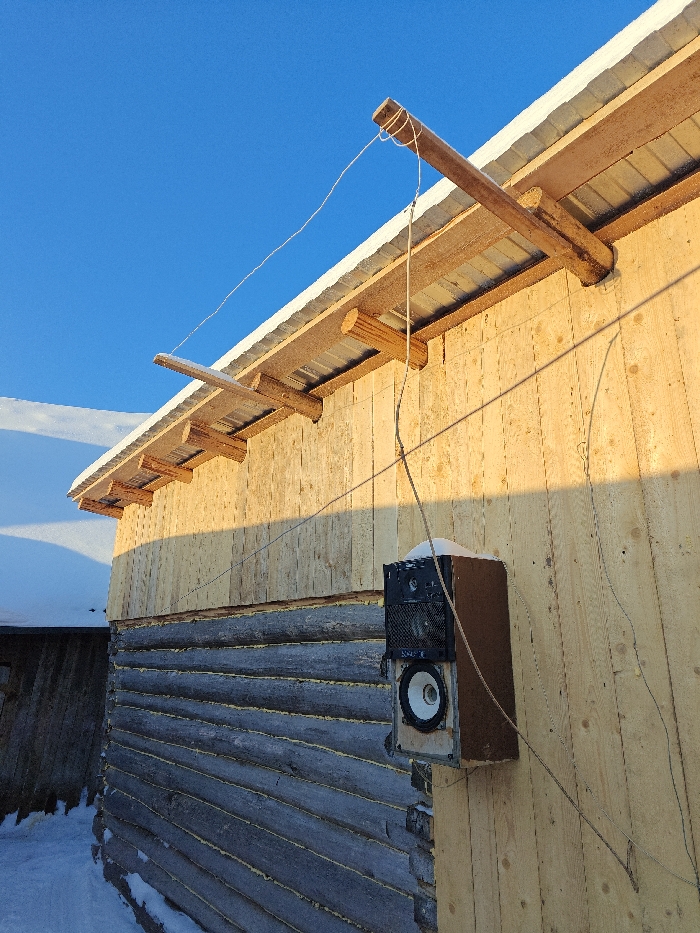 The image depicts the exterior of a two-story wooden building in Nizhnyaya Gar', Russia, under bright winter sunlight. The upper section of the building's visible wall consists of vertically oriented light-colored wooden planks, while the lower section is constructed from horizontally laid greyed logs with yellow chinking/sealant between them. A corrugated metal roof, partially covered in snow, extends over an overhang supported by rustic wooden beams and log sections. Mounted on the upper planked wall is an outdoor speaker unit, approximately rectangular in shape. The speaker consists of a darker top section with a protective grille and a lighter, possibly wooden, bottom section containing a prominent white speaker cone (woofer) and a smaller dark tweeter above it. The brand "SVEN" is visible on the lower speaker component. A thin layer of snow rests on top of the speaker enclosure. A light-colored wire or rope extends from the speaker upwards, then horizontally, secured to one of the extended wooden roof support beams via a knot. Another vertical wire descends from the same beam. The ground surrounding the building is covered in a substantial layer of snow. To the immediate left, a portion of another snow-covered structure, likely also wooden, is visible. The sky is clear and deep blue. Strong direct sunlight from the right casts distinct shadows of the speaker and wires onto the wooden wall. No individuals are present in the scene.
