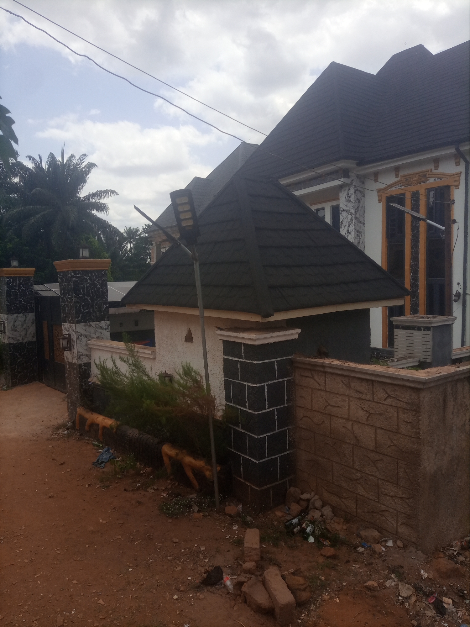 The scene depicts the exterior of a residential property in Alor, Nigeria, under an overcast sky. A multi-story building with white walls and a dark, multi-pitched shingle roof, featuring ornate golden trim around windows, occupies the right side. An outdoor air conditioning unit is visible near the building's base. To the left, a partially open, dark metal gate serves as the property entrance, flanked by two pillars tiled with a black and white marble-like pattern and topped with light-colored caps. Wall lights are mounted on these pillars. A lower perimeter wall of light brown textured blocks extends from the pillars, fronted by a dark, partially yellow-painted drainage pipe or barrier. Green foliage, including palm trees, is present behind the property. The foreground consists of an unpaved reddish-brown dirt road, scattered with debris including small rocks, a blue cloth item, and general refuse such as empty glass bottles and broken bricks near the base of the perimeter wall. A tall, dark grey street light pole with a rectangular LED fixture stands in the mid-ground. No individuals or animals are present.