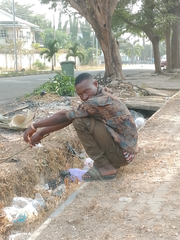 A dark-skinned male individual, with a short dark haircut, squats on a dry dirt verge beside a paved road in Gwarinpa, Nigeria