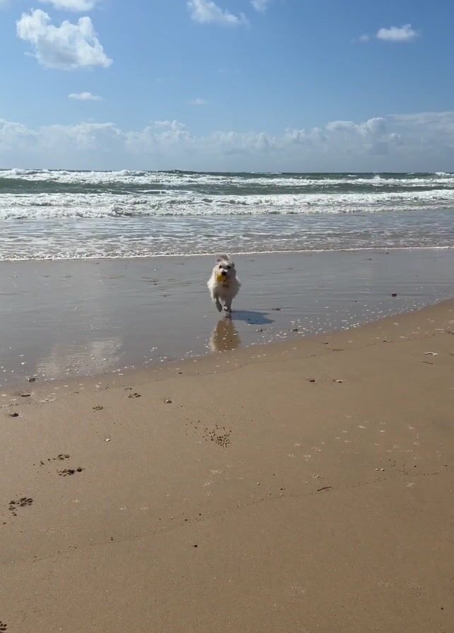 dog running on a sandy beach with a yellow ball in its mouth. The dog is wet and appears to be enjoying itself in the water. The beach is fairly empty, with a few footprints visible in the sand. The ocean waves are calm and the sky is blue with a few clouds.