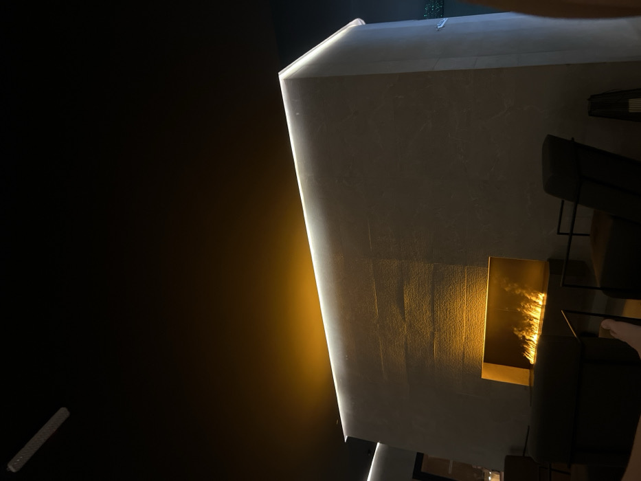 The image displays a dimly lit interior space with contemporary architectural and furnishing elements. A prominent, textured wall of light grey material spans the central and right portions of the frame. A continuous white LED light strip runs along the top edge of this wall. Recessed into the lower section of the wall is a modern, horizontal fireplace emitting bright orange-yellow flames. The wall area directly above the fireplace is illuminated by a warm orange light source, which also casts an amber glow onto the dark ceiling in the upper-left quadrant. A linear ceiling fixture is barely discernible in the upper-left. In the lower-left foreground, a bare human foot is visible, indicating the presence of an individual seated in a dark armchair, only partially visible. Another dark armchair with a minimalist frame is positioned in the mid-right foreground. A dark, open-weave decorative lantern rests on the floor to the far right. A subtle greenish light source or reflection is present along the far right edge of the frame. The precise location within the city of Plovdiv, Bulgaria, cannot be determined from the visual information provided.