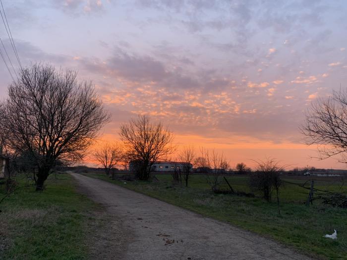 The image displays a rural landscape at sunset in Lehchevo, Bulgaria