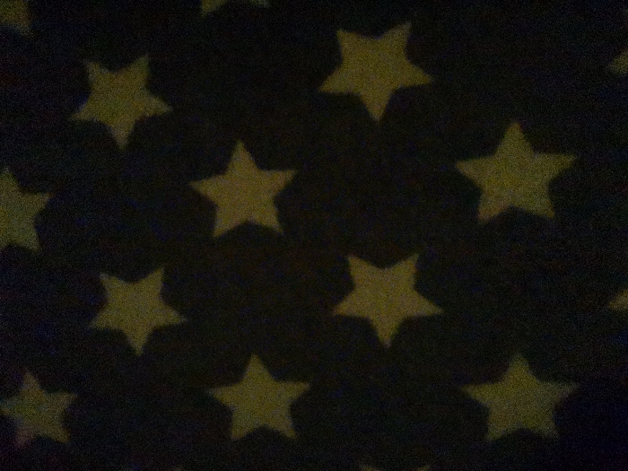 The scene is depicted within an unspecified interior location in the city of Лосева, Belarus. The primary subject is a dark, uniform background, possibly a fabric or wall covering, adorned with numerous five-pointed stars. These stars are a consistent light yellow-green color and appear to glow or be illuminated against the dark surface, suggesting luminous material or reflective properties in low light. The background exhibits a fine, grainy texture across the entire frame. The stars are arranged in an irregular, repeating pattern, filling the visible area. No individuals, distinct objects other than the patterned surface, specific actions, or interactions are discernible. The overall environment is characterized by dim illumination, enhancing the visibility of the glowing star pattern.
