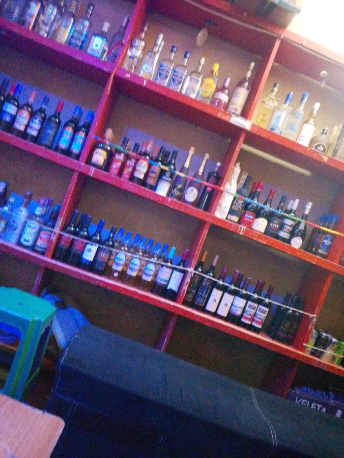 A red wooden bar shelf is stocked with numerous liquor bottles. Gin, vodka, and wine are prominently displayed on the shelves. There is a blue plastic chair and a dark blue sofa. A table is also visible. The lighting is dim, creating an intimate ambiance. The camera is angled, leading to a slightly distorted perspective.
