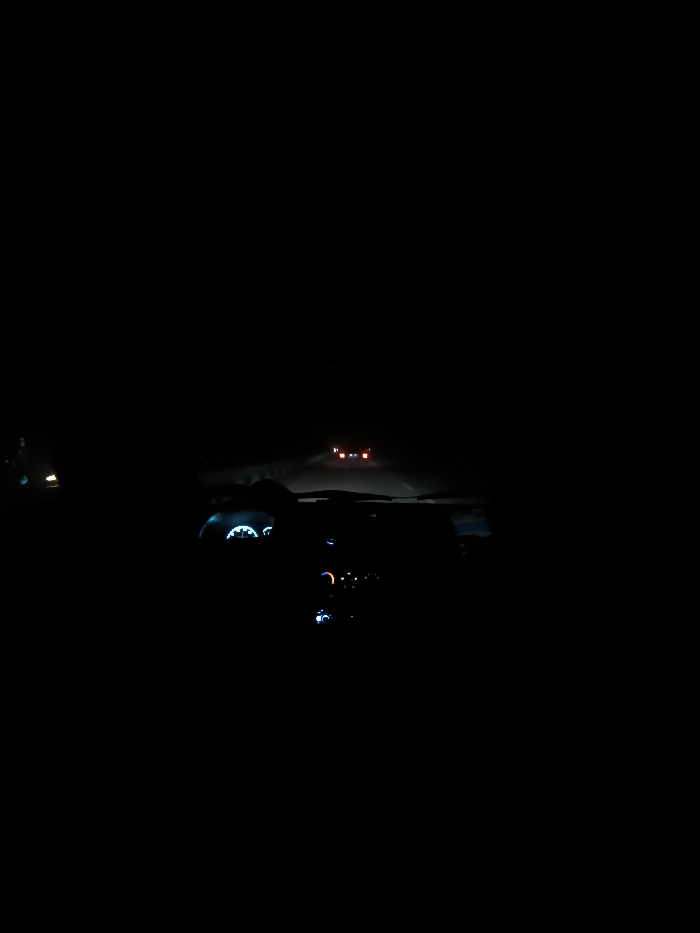 A nighttime view from inside a vehicle. The dashboard gauges emit a faint blue glow. Further ahead, the headlights of another car shine faintly on the road. The overall scene is very dark, making it difficult to discern details beyond the immediate vicinity. The dark road stretches into the distance, guided by the weak illumination.
