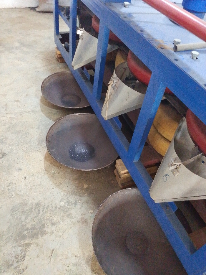 The image displays an industrial processing scene located in Olomoda, Nigeria. A prominent blue metal framework, consistent with heavy machinery, occupies the right and central portions of the frame. This structure is positioned on a light-colored concrete floor, with stacked wooden blocks visible beneath it, possibly for support or leveling. Below the blue framework, three dark, shallow, circular metal pans are arranged in a diagonal line on the floor. The middle pan contains a small, distinct conical pile of dark, granular or crystalline material. The other two visible pans are empty. Attached to the blue framework are multiple inverted, silver-colored conical or pyramidal funnels, designed to direct material downward. One of these funnels features a faint numeral "6" inscribed near its base. Behind these funnels and integrated within the blue framework, several large, red, cylindrical objects are partially visible, alongside coiled sections of yellow or brown material, possibly hoses or belts. The concrete floor exhibits scuff marks and minor discoloration, indicating an active industrial environment. In the blurry background, an indistinct white sack is partially visible. No individuals are present in the depicted scene.