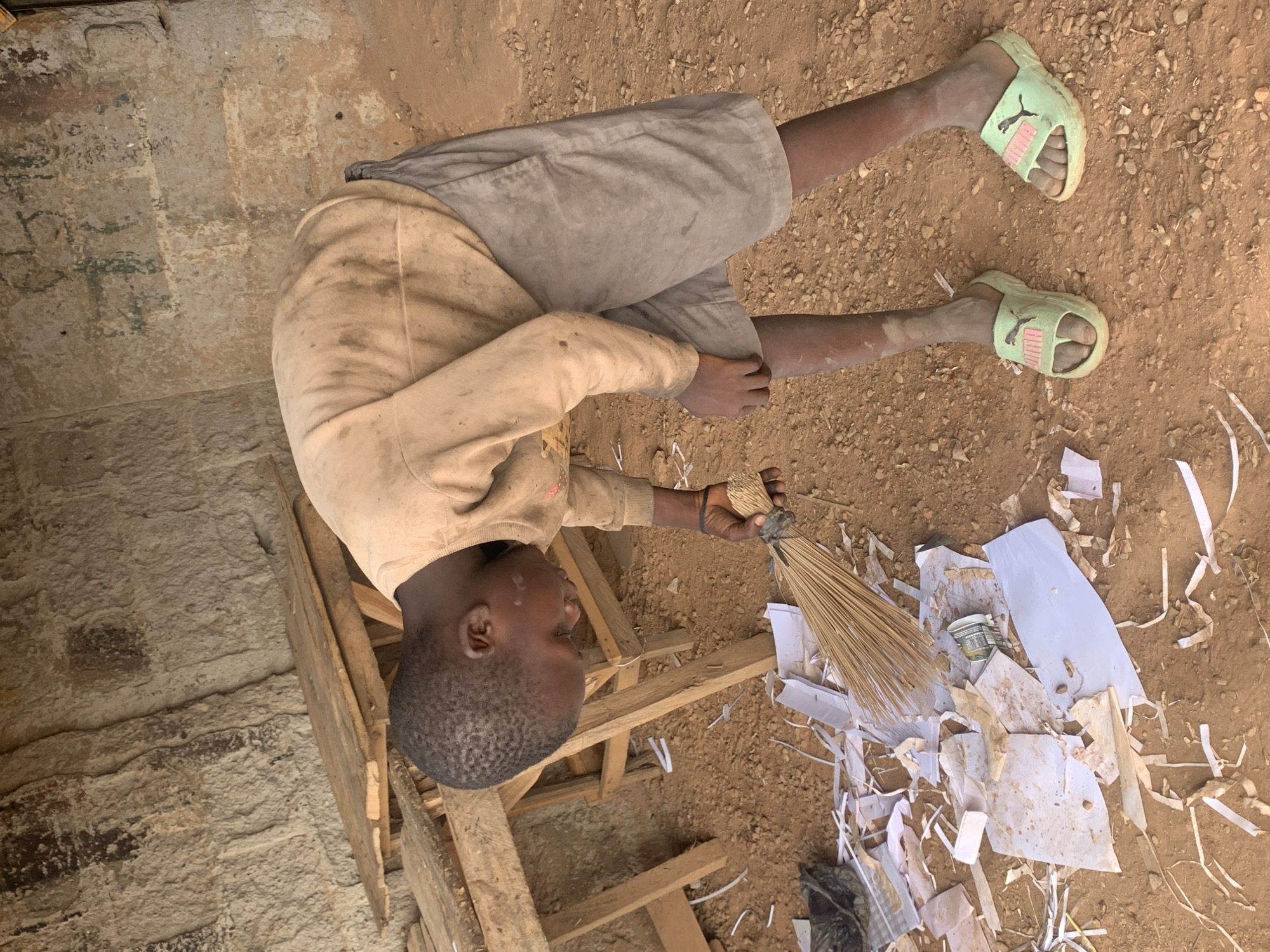 - "A young male child is depicted bending forward, actively sweeping paper debris on a dirt ground in Akwanga, Nigeria" by FM-LgEEK2, licensed under CC BY 4.0
