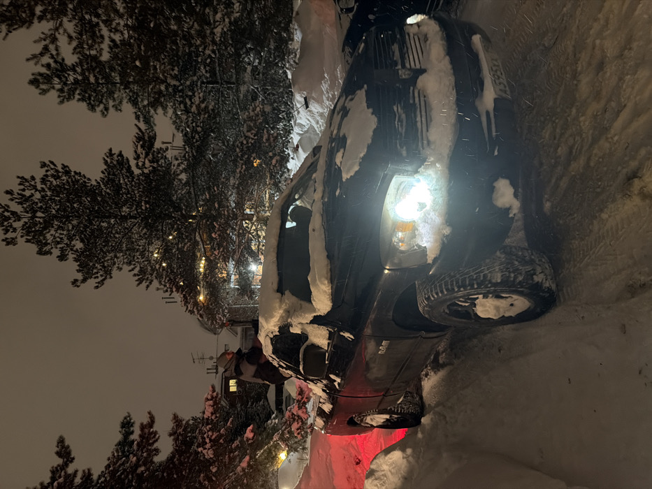A dark-colored vehicle is parked in the snow, with a headlight illuminating the scene