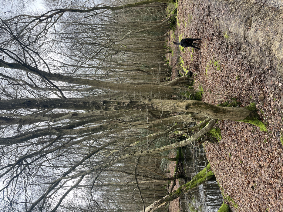 - "A black dog, viewed from the rear, walks along a muddy, leaf-strewn path in a dense, deciduous woodland" by FM-BVen32, licensed under CC BY 4.0