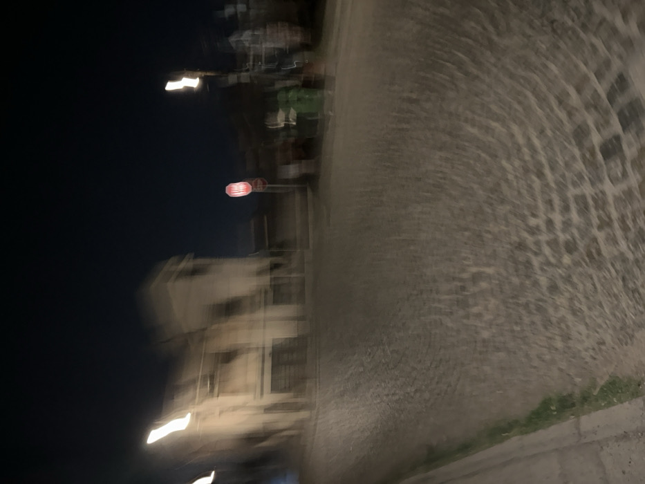 The image displays a blurred, nighttime view of a cobblestone street in the city of Unknown, Unknown