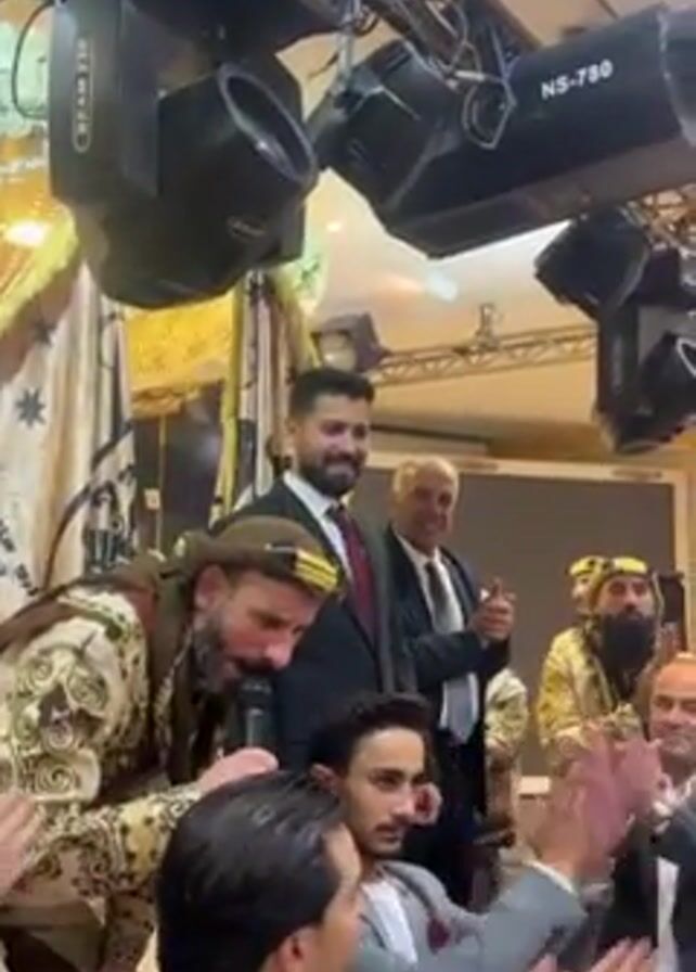 A group of men are celebrating in what appears to be a banquet hall. Several are wearing traditional headwear and garb. A man with a microphone is speaking. Others are clapping and cheering. There are light fixtures and decor on the ceiling. The room is brightly lit.