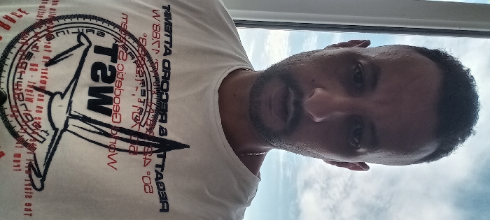 A close-up portrait shows an adult male, situated in what is reported as the city of Fez, Morocco. The subject has dark, short, curly hair with faded sides, and a trimmed beard or stubble. He looks directly forward with a neutral expression. He wears a white crew-neck t-shirt featuring a complex graphic design. This design includes a central circular emblem with the large letters "WST," the phrase "World Geodesic," numerical coordinates such as "W'88.7'" and "20° .4°," and a stylized bird or arrow. Additional mirrored text, including "REGATTA" and "ATTEMPT A RECORD," is also present on the shirt. A silver-colored chain necklace is visible around his neck. The background is softly focused, revealing a light blue sky with scattered white clouds and a portion of a vertical, light-colored frame on the left, possibly a window or door frame.