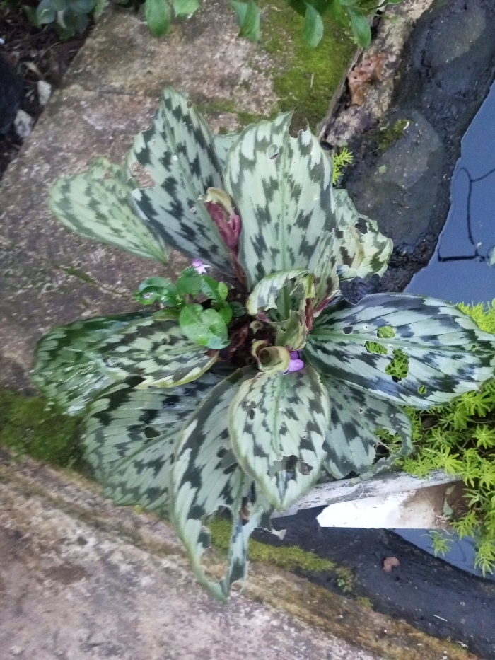 This image, taken in Balapur, India, depicts a close-up, high-angle view of a variegated plant with large, patterned leaves, positioned outdoors amidst a garden or natural setting. The central subject is a rosette-forming plant featuring broad, ovate leaves with a distinctive mottled pattern of light green and darker, irregularly shaped patches. Multiple leaves exhibit evidence of damage, including perforations and ragged edges. Small, purple flowers are visible nestled within the plant's core, along with some solid green foliage. The plant is situated on a light-colored, possibly concrete or stone surface, partially covered by green moss, which extends into the upper-left and lower-left portions of the frame. To the right of the plant, a dark, linear boundary, possibly wood or dark stone, separates the foreground from a dark body of water with a reflective, bluish surface, indicating the sky. Adjacent to this water feature, a patch of vibrant green, fine-leafed groundcover or moss is present. Additional out-of-focus green foliage is visible in the upper background. No people or animals are present, and no overt actions or interactions are occurring.