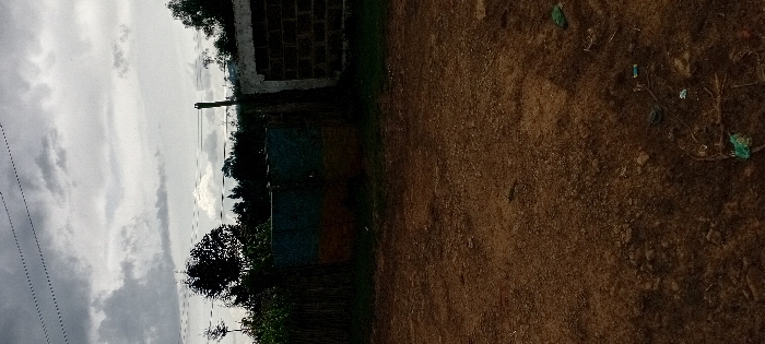 The image depicts an outdoor scene in Unknown, Kenya, under an overcast sky. The foreground features reddish-brown, unpaved dirt ground, scattered with small pieces of green and blue debris. In the midground, a rudimentary fence constructed from dark vertical stakes is visible on the left, bordering a patch of green grass. To the right of the fence, a structure with a dark teal upper section and a brown lower section is partially obscured by vegetation. Adjacent to this, a section of a concrete block wall, painted white on top, is present. A wooden utility pole stands near the center-right. Dense dark green foliage and trees line the horizon. Overhead, multiple thin, dark lines, consistent with power or communication wires, traverse the cloudy sky. No individuals are present in the scene.