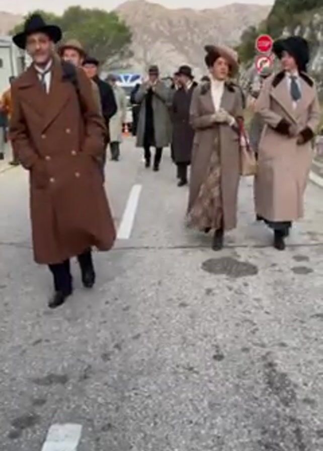 A group of people dressed in early 20th-century clothing are walking along a paved road. The men are wearing overcoats and fedora hats, while the women are wearing long dresses and hats. A mountain range can be seen in the background. There's a white film crew van and some equipment off to the left.