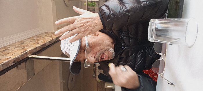 A male individual is captured mid-sentence or vocalization, seated at a white table in an indoor commercial establishment within Sidi Allal El Bahraoui, Morocco. He wears a white mesh baseball cap with a dark brim and a brown patch, clear-framed eyeglasses, and a shiny black puffer jacket. He has a grey beard and mustache. His mouth is open, and his left hand is raised with fingers splayed. His right hand, partially visible, has its index finger pointed; a silver ring is present on his right ring finger. On the white table in the foreground are a pair of folded sunglasses with reflective lenses and an inverted clear glass tumbler. The background displays a patterned light-brown tiled wall and a white ceiling with decorative molding. No distinct external landmarks are visible to confirm the specified city location.