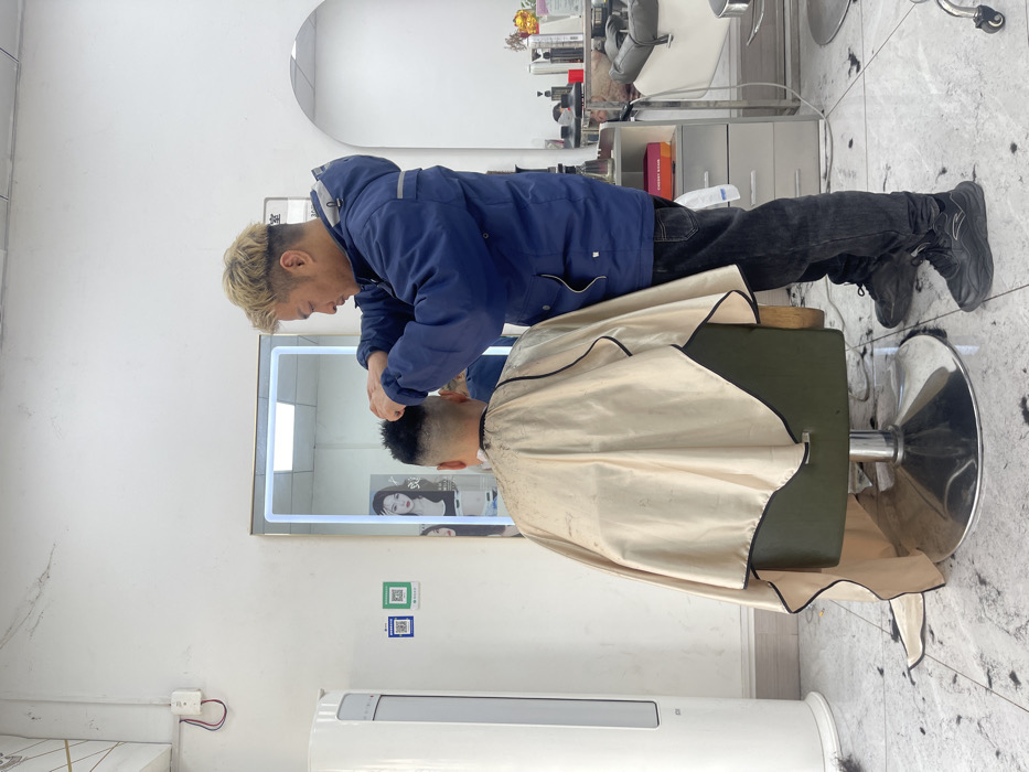 - "Inside a barbershop, a barber with blond hair wearing a blue jacket and black jeans cuts a client's hair" by FM-Yi7vn2, licensed under CC BY 4.0