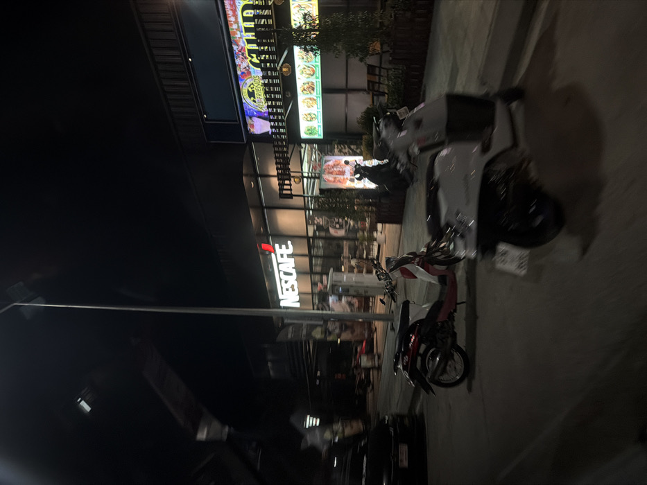 The image depicts a nighttime urban street scene in Pattaya City, Thailand. On the left, a modern commercial building houses a "NESCAFE" coffee shop, identifiable by its prominent, illuminated red and white sign. This building features large glass windows and is lit from within. To its right, an adjacent commercial building hosts a restaurant with a large, colorful sign displaying "ALL FRIENDS" in English and accompanying Thai script, along with images of food dishes. This restaurant has an outdoor or semi-outdoor seating area with tables and chairs, partially obscured by fencing and some small plants. In the foreground and midground, several motorbikes (scooters) are parked on a paved area, suggesting a parking space or sidewalk. These include a white scooter partially visible in the immediate foreground, a red and white scooter parked behind it facing left, and a dark scooter parked closer to the Nescafe entrance. A dark vehicle, likely a car, is partially visible parked on the far left. A tall street light pole stands centrally in the left half of the image, extending upwards into the dark night sky. A white utility box or vending machine is located near the entrance of the Nescafe shop. The scene is illuminated by artificial lights from the building signs, streetlights, and interior lighting, casting shadows on the ground. No discernible individuals or active interactions are visible.
