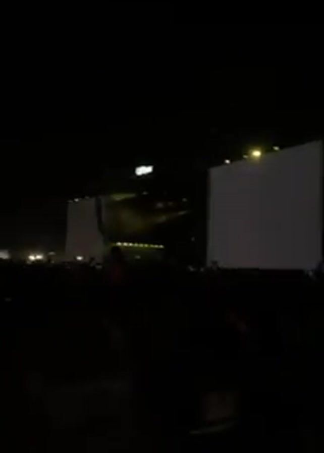 From a low-angle, partially obstructed viewpoint, the video captures a concert with a large crowd. The scene is dark, with illumination primarily from the stage lighting and large video screens displaying a performer. The focus is on the stage and the performer shown on the screens, with the crowd appearing as a mass of silhouettes. People are likely standing or moving, as one person is seen partially turning their head towards the left. The environment suggests an outdoor venue, with the stage as the focal point of activity.