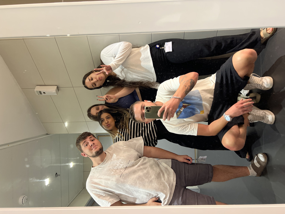 - "Six individuals, five females and one male, are reflected in a large mirror within an indoor, tiled room with a dark floor and overhead artificial lighting, located in the city of Unknown, Unknown" by FM-jZBP83, licensed under CC BY 4.0