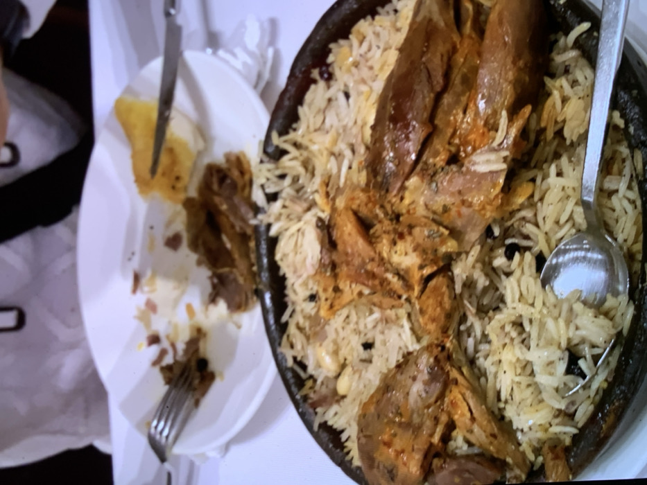 The image depicts a dining scene in Gueznaïa, Morocco. In the foreground, a large, dark, circular serving dish contains a substantial portion of seasoned rice mixed with light-colored nuts (possibly almonds) and dark specks (possibly raisins or spices), topped with multiple pieces of cooked meat, likely lamb or goat, exhibiting a browned, spiced exterior. A silver spoon rests within the rice. In the midground, a white ceramic plate shows remnants of a partially consumed meal, including small pieces of meat and rice. A silver fork is positioned on the left side of this plate, and a silver knife is visible on the right, actively cutting into a piece of light-colored bread or pastry. The background reveals the upper torso and arms of an individual, out of focus, wearing a white garment, suggesting they are seated at the table and engaged in eating. The table is covered with a white tablecloth.