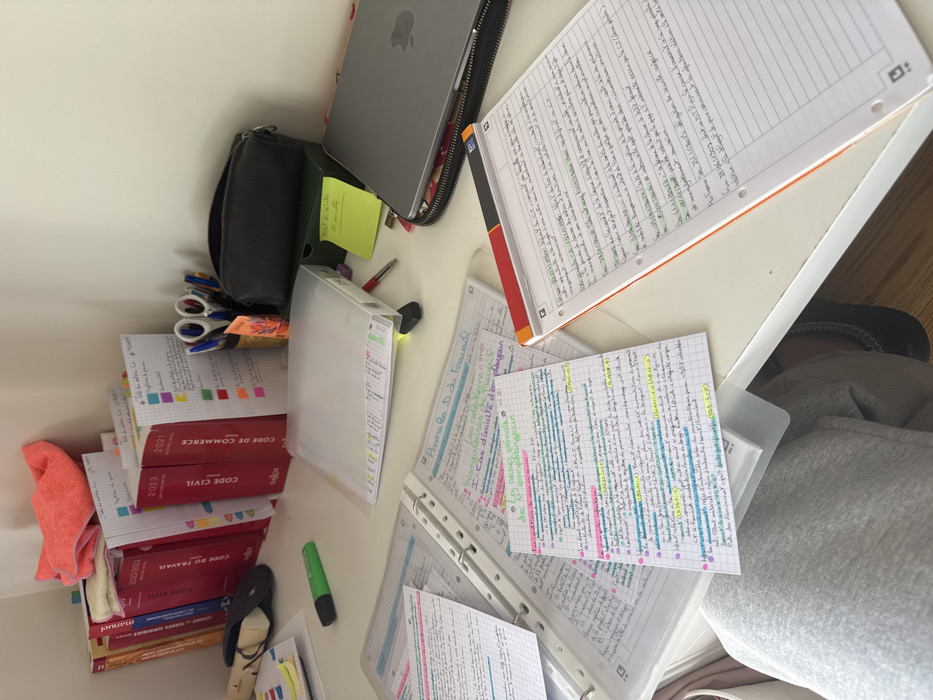 The image depicts a densely populated study desk within a presumed residence in Neuilly-sur-Seine, France. Against a white wall in the background corner, a stack of French law textbooks is visible, including "Code du Travail 2022-2023," "Code Civil 2023," and "Code de Commerce 2021," distinguished by their red spines and "Delos" publisher mark. A folded orange towel rests atop these books. On the white desk surface, a black computer mouse and a pair of black flip-flops are positioned to the left. A green highlighter pen lies centrally. The desk is covered with numerous handwritten notes on loose-leaf papers, extensively highlighted in green, yellow, pink, and blue, some contained within a white ring binder and a clear plastic folder. An orange-bound grid notebook with additional handwritten notes in green ink is present to the right. A silver Apple MacBook laptop in a black zippered sleeve rests on a dark green box in the right corner. Adjacent to it, a black pencil case and a pen holder containing various writing instruments and scissors are arranged. A yellow sticky note is affixed to the green box. The lower left quadrant reveals a partial view of a person's lap, clad in light grey sweatpants, indicating an individual is seated at the desk, actively engaged in study or work.