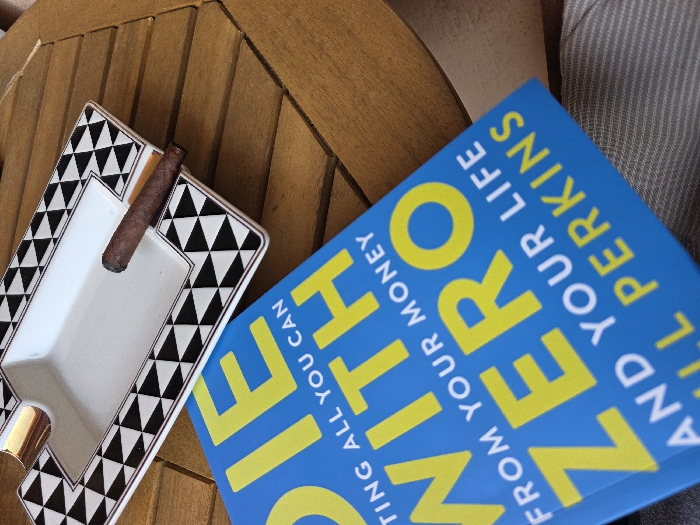 The scene depicts an elevated view of leisure items arranged on a slatted wooden table, consistent with an outdoor setting in Stara Zagora, Bulgaria. A white rectangular porcelain ashtray with a black and white geometric triangular pattern borders its perimeter and features a single gold-toned cigar rest. Within this rest, a partially consumed, dark brown cigar is placed. Below and to the left of the ashtray, a book with a bright blue cover and prominent yellow lettering, titled "DIE WITH ZERO" by Bill Perkins, lies flat. A portion of grey, possibly striped or textured, fabric is visible in the lower right quadrant, indicating the presence of a seated individual, with the book likely resting on their lap. No individuals are directly visible.