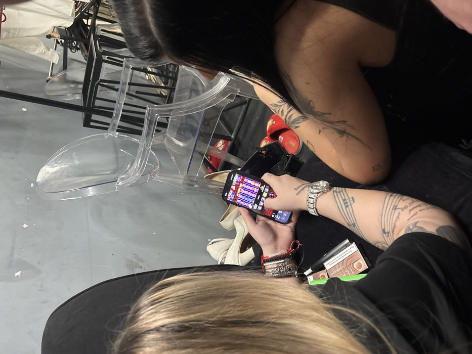 The scene depicts two individuals in an indoor setting within Plovdiv, Bulgaria, characterized by a light gray, scuffed, and unpolished wall, suggesting a utilitarian or backstage area. The person on the left, with blonde hair, is viewed from the back-left, holding a black smartphone horizontally with both hands. Their left arm is heavily tattooed with musical notes and script, displaying a silver watch and multiple bracelets. On their lap, a brown "OTTER" branded package, likely for heated tobacco sticks, rests next to a black vape pen or similar device. The smartphone screen shows a colorful grid interface resembling a slot machine or casino game. To the right, a second person with dark hair, viewed from the back-right, is leaning forward, observing the smartphone screen. This individual's right arm is tattooed with floral patterns and script. On the dark floor, a pair of white high-heeled pumps is visible on the left, and a pair of red furry slippers is on the right. In the background, a clear plastic "Ghost" chair stands next to stacked black metal chair frames.