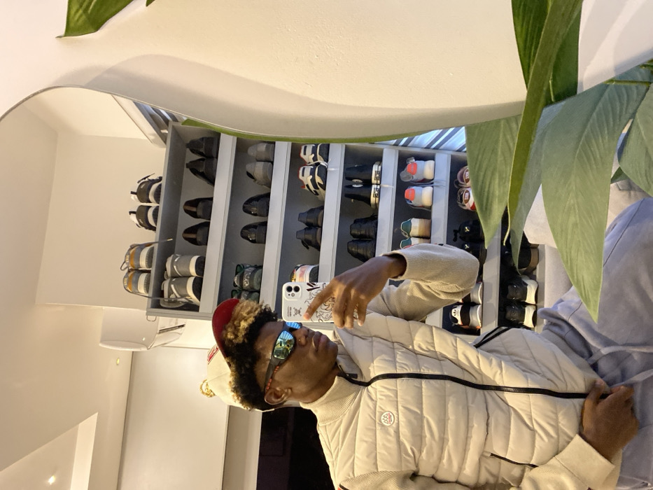 This image, purportedly taken in Igboefon, Nigeria, depicts an individual capturing their reflection in a large, irregularly shaped mirror within an indoor setting. The subject, a young male, is seen from the chest up, wearing a light-colored baseball cap with a red brim and a gold tassel, mirrored wraparound sunglasses with green lenses, and a beige puffer vest over a matching ribbed long-sleeved shirt. The vest features a black zipper and a circular patch with a red design on the left chest. He holds a white smartphone with a patterned case in his right hand, positioned to photograph his reflection. Behind the individual, a multi-tiered, light-colored shoe rack displays numerous pairs of shoes, including sneakers, dress shoes, and boots. A white wall-mounted air conditioning unit is visible in the upper left reflection. The foreground on the right is partially obscured by large green plant leaves. The overall environment appears well-lit with recessed ceiling lights and white walls.