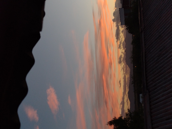 A vibrant sunset paints the sky with streaks of orange and pink clouds against a soft blue backdrop. A dark, corrugated roof edge is seen to the right, while an abstract black form is to the left, possibly a building detail. Trees and mountains silhouette against the bright sky in the middle ground. The scene evokes a serene, transitional moment.