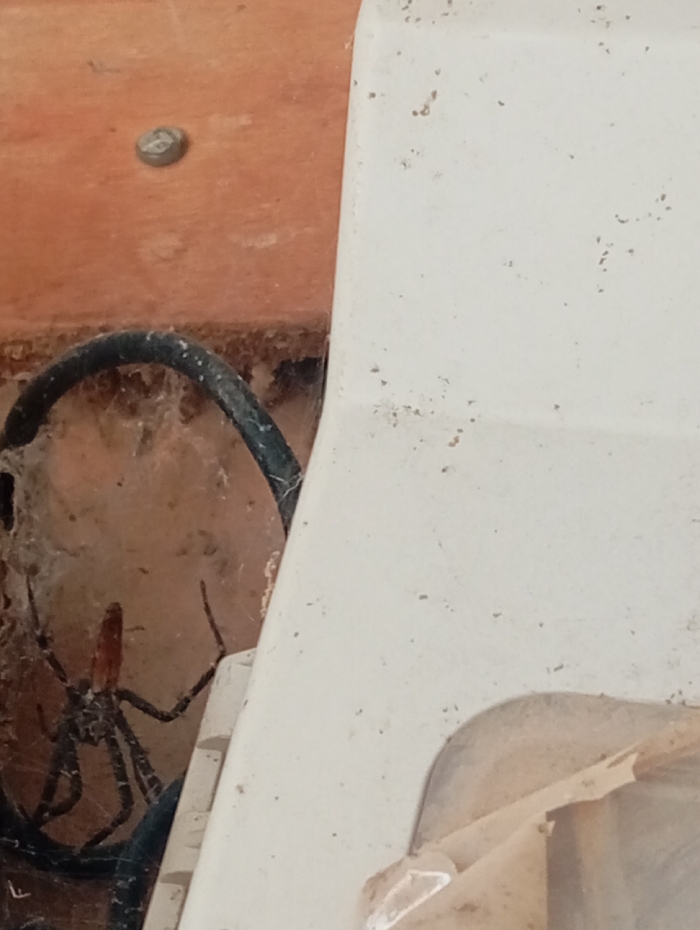 A close-up image depicts a dusty indoor corner in Gwafan, Nigeria. A large spider, exhibiting a reddish-brown cephalothorax and abdomen with dark, banded legs, is positioned on the left side of the frame, partially obscured. The spider is situated within an intricate web, with a dark, coiled cable visible behind it. The immediate background is a reddish-brown surface, likely wood or a painted wall, with a single silver screw head embedded in it. To the right, a significant portion of a light-colored, off-white object, possibly plastic or painted metal, fills the foreground. This object displays multiple small dark speckles and appears worn or dirty. In the lower right corner, a section of peeling material, consistent with tape or a veneer, is visible on the light-colored object. The overall environment suggests a neglected or utilitarian space, characterized by dust and cobwebs.