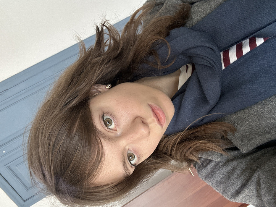 The scene is located indoors in Moscow, Russia. The image depicts a young adult female, positioned from the chest up and looking directly forward into the camera. She has long, wavy dark brown hair with bangs, light greenish-hazel eyes, and a fair complexion with visible freckles. Her expression is neutral. She is dressed in a grey collared overcoat, a white top with horizontal maroon stripes, and a dark blue scarf wrapped around her neck. A small, ornate earring with light-colored accents is visible in her right earlobe. The background behind her consists of three vertical sections: a reddish-brown wooden panel on the left, a light blue paneled door with a dark circular hardware element in the center-right, and a plain white wall on the far right.