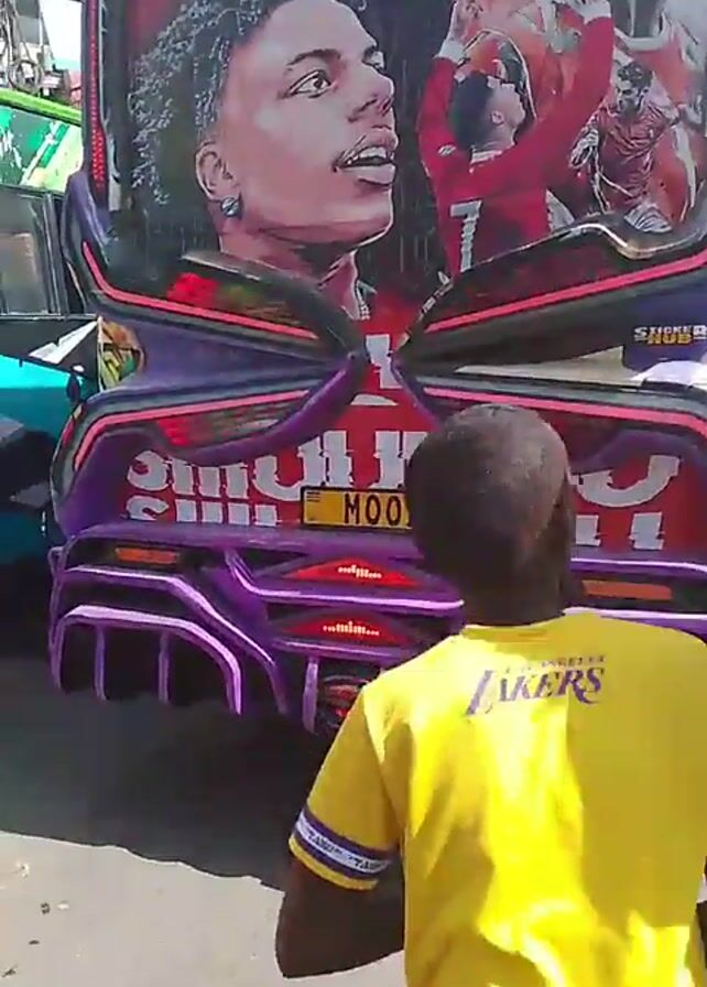 customized minibus in an urban environment. The rear of the minibus is prominently displayed, featuring an elaborate purple and red design with images of several celebrities including a portrait of a young man with curly hair, Cristiano Ronaldo in a soccer jersey, and another male figure. The license plate reads "MOOD". A person wearing a yellow Lakers shirt walks by the minibus. A man in an orange shirt stands nearby. Shadows of multiple people can be seen on the ground. Buildings are visible in the background.