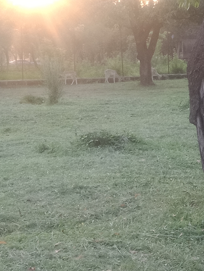 This image captures an outdoor scene in Gandu Albasa, Nigeria, illuminated by soft, bright sunlight emanating from the upper left quadrant. The foreground consists of densely matted green grass. In the mid-ground, approximately three to four light-colored, spotted deer-like animals are visible, bending their heads downwards, presumably grazing. These animals are positioned near a low, horizontal concrete or stone barrier that extends across the scene. Behind this barrier, several slender, dark vertical posts indicate a fence structure. Further back, a dense line of trees and foliage forms the background, with the outline of a building partially visible through the haze on the far right. A prominent dark tree trunk occupies the right edge of the frame, partially obscuring the background. Another tree with a visible trunk stands in the mid-ground, slightly to the right of the center. A small, bushy plant grows from the grass in the lower-mid foreground. The overall environment suggests a park or an enclosed natural habitat. No human figures are present.