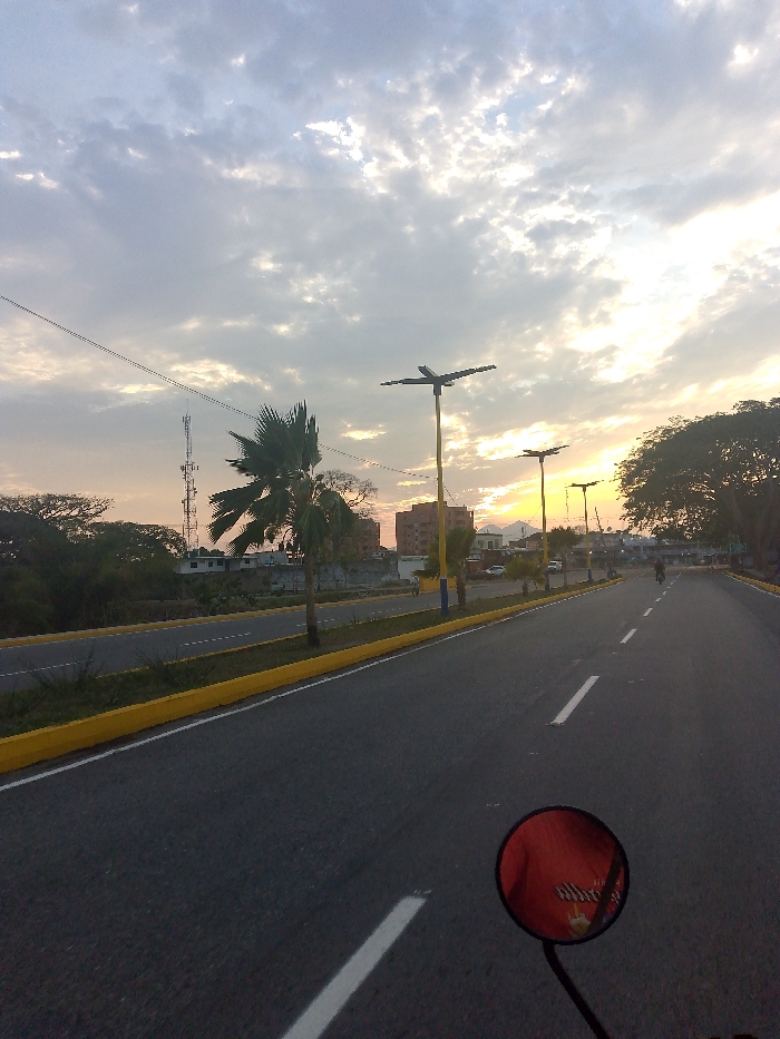 A road with two lanes and white markings stretches into the distance under a cloudy sky illuminated by the setting sun. Modern streetlights with solar panels line the road. Palm trees and a yellow curb border the lanes. In the distance, buildings and a communication tower are visible. A side-view mirror reflects the scene from the vehicle on which the photo was taken.