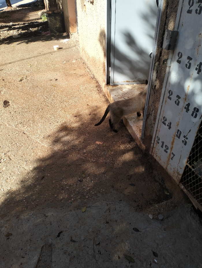 The image captures an outdoor scene in Ouaouizert, Morocco. A domestic cat, light brown with darker points on its tail, ears, and paws, stands on a concrete step, partially entering an open light-grey metal door. The door is integrated into a light-colored, textured building wall, which shows signs of discoloration along its lower portion. Strong shadows from unseen overhead foliage are cast across the light-grey door and the adjacent wall. To the right of the main doorway, an older, vertical metal structure or door panel is visible, featuring stenciled black numbers, including "23," "2348," "24 93," and "212 7," with a metal mesh grate at its lower right. The ground in the foreground consists of cracked concrete, transitioning to an unpaved area of light brown dirt and small gravel. Scattered debris, including small leaves and a white plastic cup, are visible on the ground. Defined shadows from an unseen source are cast across the ground, indicating direct sunlight.