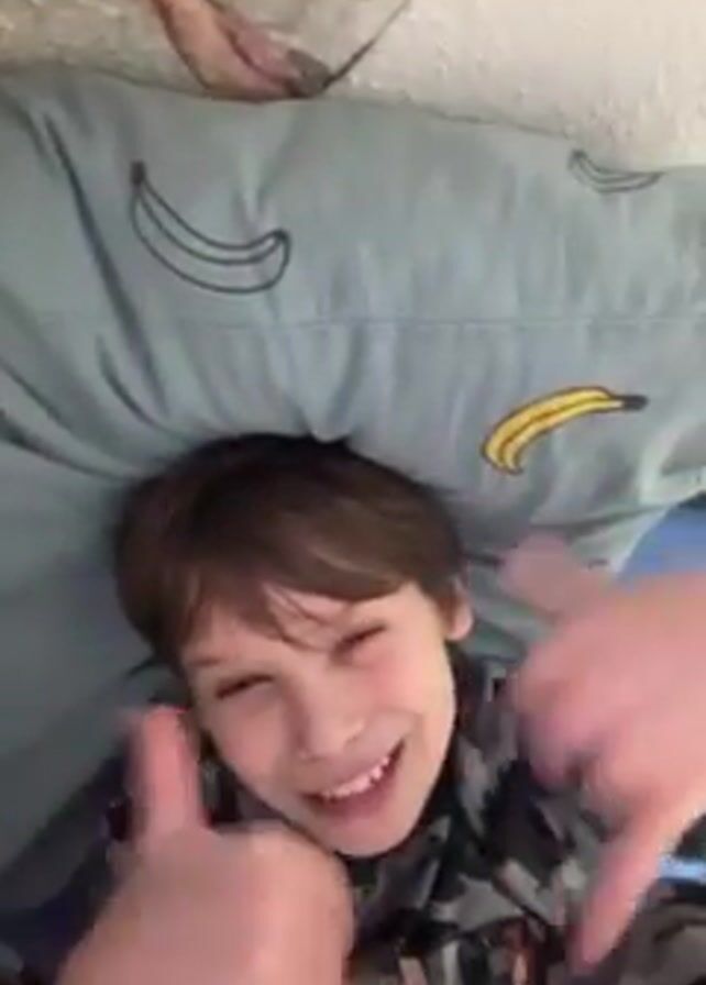 A boy with short brown hair lies on his back on a pillow with a banana print. The boy wears a gray and black camouflage-patterned long-sleeved shirt. He makes hand gestures, then puts his hands on his cheeks and opens his mouth wide. A dog's leg appears in the top left corner of the frame.