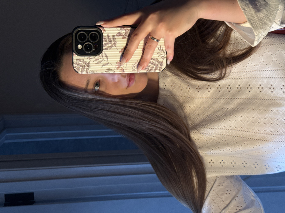 A female subject is depicted in a mirror selfie, seen from the chest up, indoors. She has long, dark brown hair, light-colored eyes, and is wearing a white, long-sleeved top with an intricate broderie anglaise or eyelet pattern. Her right hand holds a smartphone, partially obscuring the lower right side of her face, with the camera array visible. The phone is encased in a light-colored cover featuring thin vertical stripes and a botanical design with reddish-brown leaves and pink floral accents. A metallic ring is present on the ring finger of her right hand, and her fingernails are painted a light shade. The background reflects a dimly lit interior space, with a dark blue-grey vertical panel or wall segment and a vertical line, possibly indicating a door frame or wall edge, visible on the left side of the frame. The precise location within Tlustenkhabl, Russia, is not discernable from the visual content.