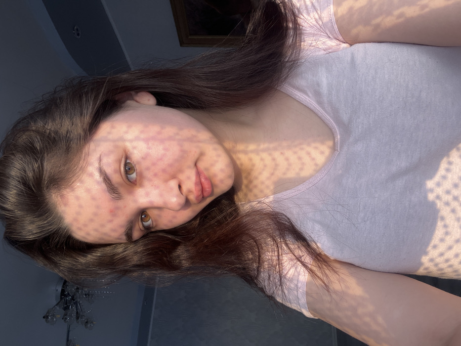 - "A young woman with long, dark brown hair and fair skin poses in sunlight, casting shadows with a circular pattern on her face and neck" by FM-jR63L2, licensed under CC BY 4.0