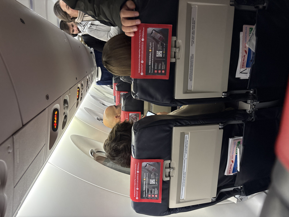 An interior view of an airplane cabin shows seated passengers. Tray tables are folded up. Red seat back pockets display information about "Regional Play," an entertainment service, and general seatbelt/life vest instructions. The airline's branding, "Iberia Air Nostrum" is visible in the seat back pockets. The lighting is bright, highlighting the rows of seats and passengers. The overhead compartment is visible along the upper left.