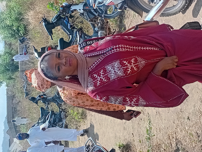 A woman in a maroon embroidered dress and beige headscarf stands outside with motorcycles in the background. A woman in a patterned tan headscarf stands next to her. Two men in white traditional clothing are visible in the distance. The setting appears to be a rural or semi-rural area with sparse vegetation and buildings visible in the background. The image seems casually posed, capturing a moment outdoors.