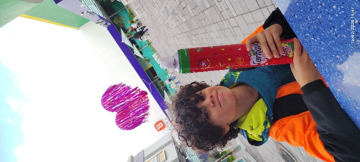 A boy with curly hair holds a red "Carnaval" party favor. He wears a blue and green hoodie with an orange and black shirt. In the background, there is a purple heart-shaped decoration. He's standing in front of a patterned building with a group of people visible further away. The sky is visible on the left side of the frame. The photo was taken on 16/02/2020 at 16:47.