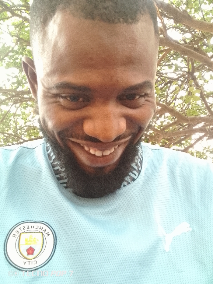 A man smiles at the camera while wearing a light blue Manchester City Puma jersey. He has dark skin, a trimmed beard, and a shaved head. The jersey has the Manchester City logo on the left chest and the Puma logo on the right. Leaves and branches are visible in the background. The words "TECNO POP 7" are at the bottom of the image.